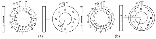 The N-turn hollow ring coil is wrapped around the skeleton of nonferromagnetic material, which is the simplest Rogowski coil. The working principle of measuring current is shown in Figure 1a [19]. The current flowing through the wire will generate a magnetic field around it, when the wire is infinitely long, the wire medium is uniform and there is no return current, according to Ampere’s circuital law that is: