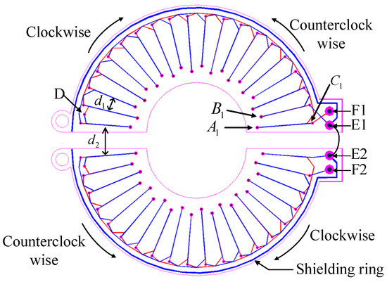Rogowski coils are widely used in high-frequency current measurement conditions because of their simple structure, good linearity, and wide measurement band [1]. Conventional Rogowski coils are wound manually or by means of a winding machine, and the wires are wound on non-magnetic materials such as rubber and Bakelite. This fabrication method does not guarantee the consistency of the parameters of the mass-produced Rogowski coils [2]. Therefore, the scholar Kojovic first proposed the idea of designing a new type of Rogowski coil based on (PCB) [3,4,5,6]. This type of coil can be designed by computer aided design software. Moreover, mature PCB processing technology can be used to improve manufacturing accuracy and reduce production costs, while ensuring the uniformity and consistency of multiple production coils [7]. Most of the existing PCB Rogowski coils are closed-ended. In order to avoid breaking the circuit and to facilitate installation and disassembly in practical use, it must be designed as an open-ended structure. In the open-ended structure, the loop at the opening is incomplete. How to ensure that the opening has no effect on the anti-interference ability of the external magnetic field of the coil has become an urgent problem to be solved. In Reference [8], a Rogowski coil structure with differential winding design was proposed to eliminate the interference of external magnetic fields in the vertical direction. However, there are too many holes and the winding cannot guarantee uniform distribution at the opening, which cannot reduce the interference of external magnetic fields in the horizontal direction. In the Rogowski coil winding method, reference [3] uses two opposite PCB Rogowski coils to offset the interference caused by external magnetic fields, but due to the number of turns and doubling of layers, its frequency band will be significantly reduced. Reference [9] proposed a PCB Rogowski coil design with symmetrical double-sided wiring and equal area loop. This monolithic structure avoids the interference caused by the inter-plate gap [10], but the parameter calculation is complex. In Reference [11], the loop was designed as a return coil, which traveled along the same path as the main coil; however, in the opposite direction, a circular arc was used to bypass the adjacent holes of the outer ring. This achieved the purpose of staggering the different distribution line, avoiding the complex calculation. This method did not make full use of the measurement space. Reference [12] proposed a method to design PCB Rogowski coil with multiple turns and large mutual inductance in a limited space, but this winding method has a right-angle line, which will have a negative impact on the signal [13].