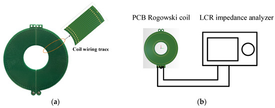 The electrical parameters of Rogowski coil were measured by LCR3535 impedance meter of HOKA company. Figure 6a is the physical diagram of the open-ended PCB Rogowski coil, and Figure 6b is the schematic diagram of the coil electrical parameters measurement experiment. The inductance of the coil is 9 μH, and the resistance is 25.6 Ω. The lumped stray capacitance in the coil cannot be directly measured. Usually, the first resonant frequency of the amplitude-frequency response of the impedance is used for theoretical deductions. The formula is as follows: