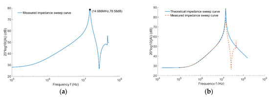The impedance of the Rogowski coil is measured by sweep frequency, and the measurement results are shown in Figure 7a. From the measured impedance sweep curve, it is known that the first resonance point of the coil’s impedance is at 14.68 MHz. According to Equation (18), the total set stray capacitance is 12 pF. According to Equation (17), the theoretical sweep frequency curve is obtained and compared with the measured impedance sweep frequency curve. The results are shown in Figure 7b.