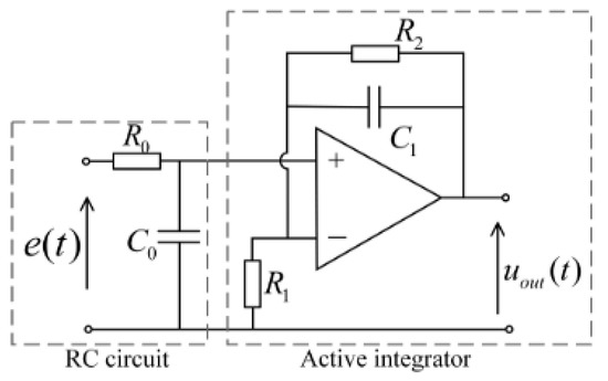 External integrator has source integrator and active integrator. The simplest passive integrator is only composed of a resistor R and a capacitor C. The passive integrator must use the integrator with large RC time constant to ensure that the low frequency component of the signal is not distorted, and the high frequency response ability of the integrator will deteriorate. Different from the passive integrator, the active integrator is not easily affected by the load at its output end, and its range can be extended to the low-frequency part. However, since the active integrator will increase its low-frequency gain, amplify the low-frequency noise and affect the measurement results, the range of active integrator should not be excessively expanded. Reference [18] proposed a hybrid integrator, as shown in Figure 9: