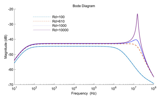 In addition, the selection of load resistance is also crucial for the whole measurement system, and its reasonable selection can better broaden the high frequency cutoff frequency of the measurement system. According to the optimal damping coefficient, the second order system is 0.707 and, in Equation (10), the load resistance of Rogowski coil is 610 Ω. Figure 12 simulates the amplitude-frequency response curves of several sensors with different load resistance. From the graph, the system response is better when the load resistance is 610 Ω.