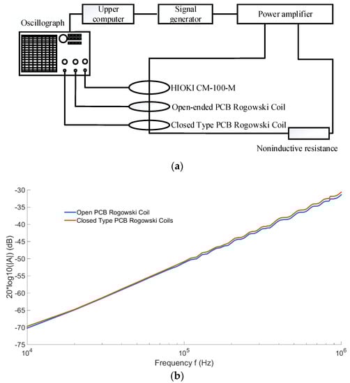 In order to verify the performance of the open-ended PCB Rogowski coil probe, the experimental platform in Figure 13a was built using a signal generator, a power amplifier, a non-inductive resistor, a host computer and an oscilloscope. The upper computer is programmed by LabVIEW. It controls the signal generator and oscilloscope, changes the frequency of the sine of the signal generator, outputs a voltage of constant amplitude and varying frequency, and controls the oscilloscope to collect the output voltage signals of the HIOKI CM-100-M, and both the closed and open-ended PCB Rogowski coil. (The parameters such as Wiring method, number of turns and size of the closed PCB Rogowski coil are the same as those of the open-ended Rogowski coil). The three signals are processed to obtain the measured amplitude-frequency response curves of the open and closed-ended Rogowski coils. As can be seen from Figure 13b, when the measurement conditions are the same, the output amplitude-frequency characteristic curves of the closed and open-ended PCB Rogowski coils are basically the same, and the difference between the mutual inductance values is less than 0.5%.