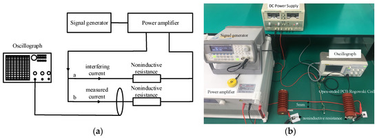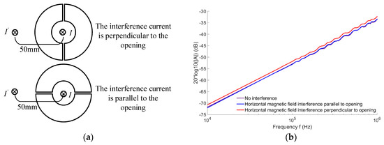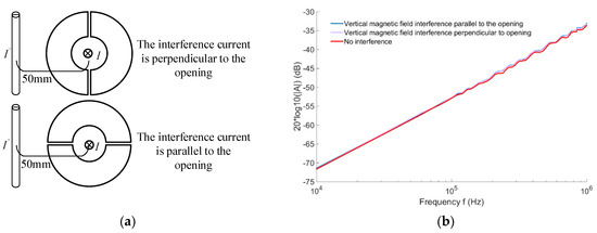 The experimental platform for generating the interference current and the measured current is set up as shown in Figure 14a. The current generated by the power amplifier is separated into two identical current signals through two inductanceless resistors with the same resistance value in the two branches of a and b, where branche a is the interference signal and branche b is the measured signal. Figure 14b is the experimental scene. The interfering current and the measured current are placed in the same plane and parallel to each other, the distance between the two centers is 50 mm, and the current magnitude is equal to 1A. The interfering current-carrying conductor is positioned parallel or perpendicular to the coil opening, as shown in Figure 15a. The results of the coil amplitude-frequency response curves of the two placement methods are shown in Figure 15b. It can be seen that when the coil interference current is perpendicular to the coil opening, the magnetic field interference parallel to the PCB plane has a very small effect on the output characteristics of the coil, only 0.73%, which is due to this placement method. The wiring of the left and right half-loops of the coil is basically the same. This makes the parallel interference current in the left and right loops of the coil, generated by the induction potential, of equal size and opposite polarity, thus canceling each other. When the coil interference current is parallel to the coil opening, the effect of the magnetic field interference parallel to the PCB plane on the coil output characteristics is also relatively small, only 1.45%. This is because the coil closure is not guaranteed to be absent of any air gap at all.