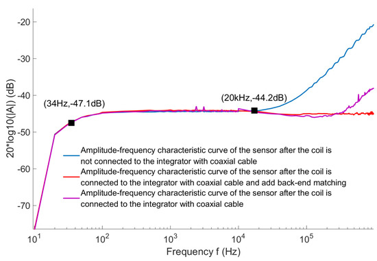 In order to verify the influence of different integral configurations on the overall performance of open Rogowski coil current sensor, using the platform built in Figure 13a, the open Rogowski coil is connected with three different integral configurations, such as no coaxial cable, coaxial cable, coaxial cable and back-end matching. The amplitude-frequency characteristics of the sensor under three configurations are compared. Repeat the above experiments, the amplitude-frequency response curve of the sensor shown in Figure 17 is obtained. It can be seen that in the frequency range of 34 Hz–20 kHz, the amplitude-frequency characteristic curves of the sensor in the three integration configurations remain the same. In the frequency range of 20 kHz–1 MHz, a very obvious resonance appears under the condition that the coil is not connected to the integrator with coaxial cable, and after adding the coaxial cable, the resonance appears to be better, and after adding the coaxial cable and adding the back-end matching, the resonance appears to be significantly better. The experimental results show that the high frequency measurement can be significantly improved by connecting the Rogowski coil to the integrator with the coaxial cable and adding the back-end matching circuit.