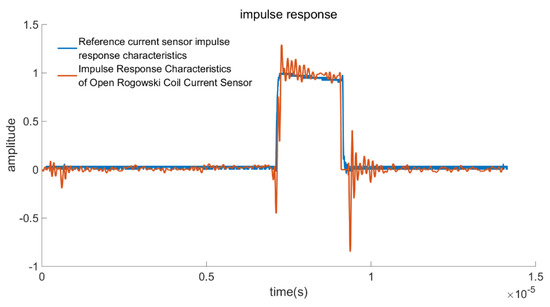 In order to better observe, the pulse current signals measured by Reference HIOKI CM-100-M and open-ended PCB Rogowski coil are normalized to obtain the response diagram of the sensor pulse signal, as shown in Figure 19. It is known that the response process of the reference current sensor matches well with the response process of the Rogowski coil current sensor. The measurement signal of the open-ended PCB Rogowski coil current sensor shows high signal fidelity, but oscillates around the measurement signal of the reference sensor. These oscillations are caused by the capacitive coupling of the Rogowski coil to the pulsed power supply and are mainly concentrated during the rising and falling edges of the current pulse. The rise times of the reference current probe and the open-ended sensor were measured to be 100 ns and 102 ns, and the high-frequency cutoff frequency of the measurement system was calculated to be >3.5 MHz based on the relationship between the rise time and the highest frequency measured [32]. The calculation formula is as follows: