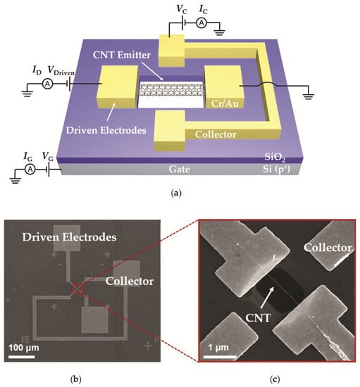 The schematic structure of a CVT is shown in Figure 1a, where a multiwalled CNT, acting as a filament, is freely suspended above a heavily doped Si substrate and pressed between Au/Cr electrodes. To excite thermionic electron emission from the CNT, a bias voltage (VDriven) is applied to the suspended CNT, thus an electrical current (ID) will pass through and heat it by self−Joule heating. A pair of Au/Cr electrodes with a collecting voltage (VC) of 50 V are beside the CNT acting as the collector electrodes. As demonstrated in pervious works, thermionic electrons emit from a Joule−heated carbon nanotube while a bias voltage applied to it is larger than a threshold value, and the emission current increases exponentially with the bias voltage [,,]. To switch emission current collected by the collector electrodes (IC), the heavily doped Si substrate underneath the suspended CNT works as the gate electrode with a bias voltage (VG) of −10–40 V. Figure 1b shows a scanning electron microscope (SEM) image of a CVT, and the magnified SEM image of the center area of the CVT is shown in Figure 1c, in which the distance between collector electrodes and electron emitter is approximately 1.5 μm.