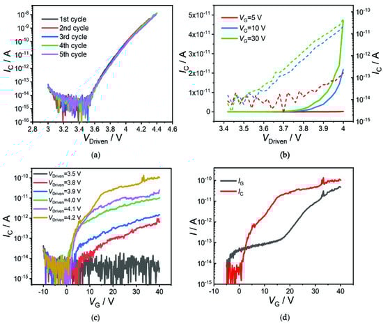 The performances of CVTs are measured on a probe station at room temperature with the vacuum level of about 1 10−2 Pa utilizing a Keithley 4200 semiconductor characterization system. The emission current of a multiwalled CNT electron emitter is measured repeatedly with collector electrodes applied with 50 V and gate electrode vacant. The device exhibits repeatable electron emission for five different measurements, as shown in Figure 2a. There is no emission current collected by collector electrode until VDriven is larger than ~3.6 V, and the maximum emission current can reach up to 10 nA when VDriven is ~4.4 V. It can be seen from Figure 2a that IC increases exponentially with VDriven, in good agreement with previous observation of thermionic emission from a suspended CNT [,,]. As the collecting voltage is fixed at 50 V and thus electric field at the surface of the CNT is almost unchanged during the measurements, electron emission is not governed by electric field. The electron emission from a Joule−heated CNT is attributed to thermionic emission mechanism with non−thermal equilibrium electron distribution [,].