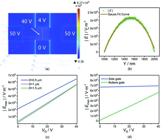 Figure 4c shows the dependence of || on VG for the devices with different D. It can be seen that || increases from 1.63 × 107 V·m−1 to 5.60 × 108 V·m−1 by more than 30 times with the increase of VG from 0 V to 40 V when D is 1.5 μm. In contrast, || only increases by 2.99 and 17.26 times with the same increase of VG from 0 V to 40 V corresponding to a D of 0.5 μm and 1.0 μm. The CVT with D of 1.5 μm therefore has a stronger gate controllability of || by VG than that of other CVTs with shorter D, which is in good agreement with the experimental results in Figure 3a. The poorer gate-to-emitter controllability for shorter collector-to-emitter distance can well be understood, by considering the fact that the electric field at the surface of CNT emitter is mainly governed by the collector but not the gate in the case of short collector-to-emitter distance.
