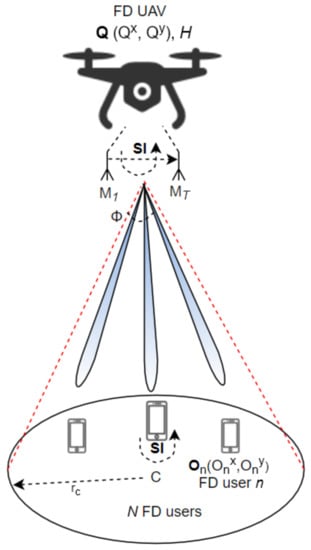 Concurrently, the increase in wireless data traffic forced the limits of communication systems in terms of reliability and throughput []. In band full duplex (IBFD) communication allows bi-directional communication at the same frequency and time, which doubles the system capacity and improve spectrum efficiency compared to the traditional half duplex (HD) systems [,,]. The IBFD systems are of great interest among researchers, and there has been some work in the literature where IBFD systems are utilized with UAVs to propose and solve new problems. For example, in [], the UAV was deployed as a full duplex (FD) relay to minimize the outage probability of the relaying system. In [], spectrum sharing planning was studied in a scenario where FD UAV was considered as a relay in device-to-device cellular systems. In [], FD UAV-based small cell wireless system was considered, where the UAV was deployed as a base station to serve downlink (DL) and uplink (UL) users in a FD manner. The UAV trajectory, user scheduling, and UL user transmit power are alternately optimized to maximize the total capacity of the system.