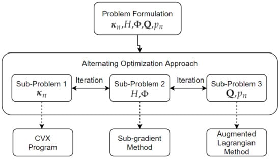 Here, , , , and are the positive gradient-search step sizes. , and are the values of the Lagrange multipliers at iteration t, and and are the values of the Lagrange multipliers at iteration o. Further, the optimal values of , , , and are used in their respective KKT conditions to find the optimal values of H and . In the sub-gradient method, the optimal value of H should also satisfy constraint (14e) and should also satisfy constraint (17d) in problem (14) and (17), respectively. It is to be noted that the optimal values of H and are independently found using the sub-gradient method in iterative loops with iteration t (fixed ) and o (fixed H), respectively.