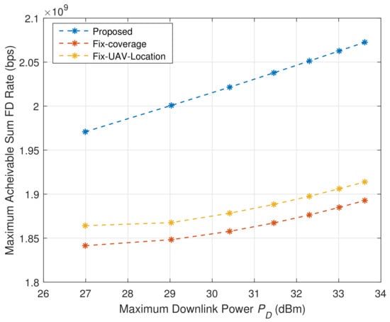 We analyze the performance of the proposed system and validate its dependency on the maximum DL power in Figure 3 and Figure 4. The maximum achievable sum FD rate for , dBm and different values of maximum DL power is shown in Figure 3. Similarly, the maximum achievable sum UL and DL rates are shown separately in Figure 4. It can be seen in Figure 3 that the sum FD rate is an increasing function with respect to the maximum DL power for all the considered algorithms. In Figure 4, the sum DL rate increases with while the sum UL rate is constant and does not depend on the due to the feasibility of constraint (13e) in problem (13). Moreover, even after the lower value of than and equal weights for UL and DL objectives, the sum UL rate is higher than the sum DL rate. This is mainly because of the co-channel interference which reduces the DL SINR at the users. The performance comparison of the algorithms shows that the proposed algorithm outperforms the other baseline algorithms because the proposed algorithm considers the joint optimization of DL beamfomer, beamwidth, altitude, and location of the UAV, as well as the UL power of the users. Additionally, we observed that the UAV’s coverage optimization is more crucial than the location and it significantly improves the FD performance. It can be seen in Figure 3 that the fix UAV location algorithm has improved FD rate values than the fix coverage algorithm due to optimized altitude and beamwidth.