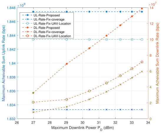 Maximum achievable sum DL and sum UL rate versus maximum DL power.