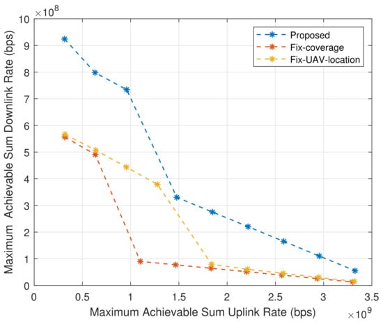 The computational complexity in Algorithm 1 is dominated by (i) step 3, where the DL beamformer of the UAV for each user n is calculated by using SDR problem (13) in a CVX program, (ii) steps 11–12, where the altitude and beamwidth of the UAV are optimized by using the sub-gradient method, and (iii) steps 14–19, where the horizontal location of the UAV and UL power of the users are independently optimized by using ALM. The complexity order for handling sub-problem 1 is [], for sub-problem 2a and 2b is , and for sub-problem 3 is , where is the solution accuracy. Therefore, the overall complexity of the proposed joint optimization Algorithm 1 is .