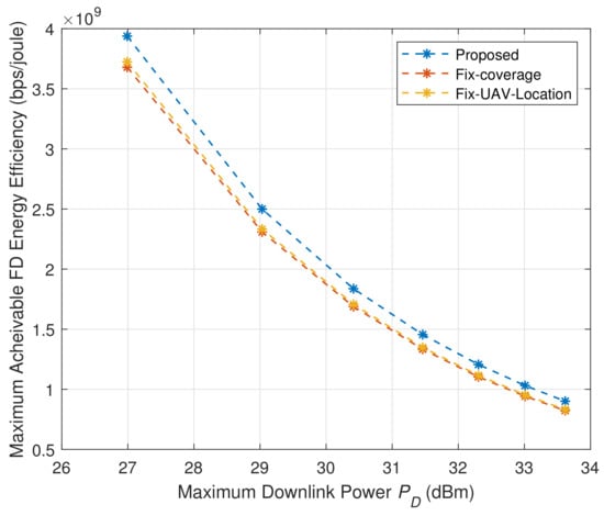 Maximum achievable FD energy efficiency versus maximum DL power .
