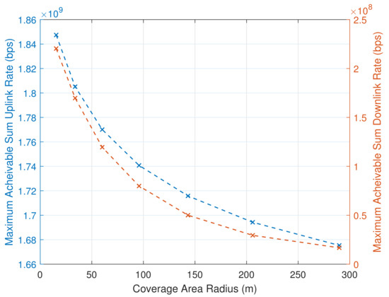 Maximum achievable sum DL and sum UL rate versus coverage area radius .