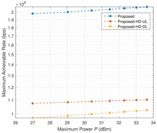 To show the impact of the coverage area on sum UL and DL rates, we optimize sum UL and DL rates using fixed coverage algorithm for different values of coverage area radius and show the results in Figure 7. It is easy to see that both the sum rates decreases with increase in the coverage area and the effect is more prominent in the DL. Finally, we compare the proposed FD system with the similar HD system. In other words, we consider that the UAV and users are equipped with HD radio in Figure 1, where antennas are utilized for transmission and reception at separate and equal time instants. Therefore, we consider that , , and co-channel and self interference are neglected. Figure 8 shows the performance comparison between proposed FD and HD systems. For fair comparison, we consider that maximum UL and DL powers in the HD system are equal and defined by a single variable P in the Figure 8. Additionally, in the FD system is equal to P. From comparison, we found that on average, FD system provides rate improvement of 0.9399 Gbps and 1.0266 Gbps over HD system’s UL and DL rates, respectively.