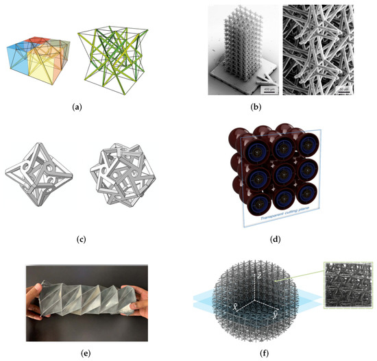 Examples of 3-D metamaterials. (a–c) Mechanical metamaterials [10,11,12]. (d) Acoustic metamaterial [13]. (e) Antenna [14]. (f) Electromagnetic metamaterial [15].