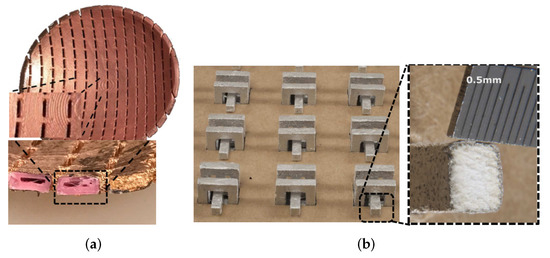The first one to be described is conventional manufacturing with 3-D assembly. As mentioned above, this fabrication technique can be represented by any traditional manufacturing technique such as PCB manufacturing, computer numerical control (CNC), or electrical discharge machining (EDM), which entails a separate fabrication of the parts that conform the prototype and, later, an assembly of these parts in three dimensions. Examples of this kind of prototyping are found in [141,143,146,163]. In all of these studies, the 3-D unit cells have been manufactured with different PCB layers stacked both horizontally and vertically, forming the sides of the unit cells. To assemble these pieces in a simple way, different grooves are implemented to interlock them all together (see Figure 21c from [143]). In addition to this mechanical assembly, most of these designs require the application of conductive glue [163] or solder [143,146] in the assembly areas (grooves) to avoid any electrical discontinuity that could damage the electromagnetic behavior of the manufactured prototype. An alternative for 3-D assembly with PCB layers is the one presented in [138], where the connecting and supporting elements between the two layers are copper wires, which in turn have a beneficial effect on the electromagnetic response. Thanks to the 3-D geometry of the unit cells, lumped elements or homogeneous materials with a given dielectric properties are relatively easy to insert into the unit cells. Some examples in 3-D PCB assembly are shown in [142,147,156] and Figure 3a illustrates a unit cell where magnetic material is included in its structure. In general, due to the current applications, these external elements are lossy such as resistors or magnetic/dielectric materials to design absorbers [147] or rasorbers [142,156]. However, in these last two studies, additional metal structures (for example, conducting planes) had to be fabricated separately to allow for the integration of the lumped elements or the lossy materials. On the other hand, a conventional manufacturing technique EDM has also been employed to achieve an all-metal metamaterial. One of the example that utilizes this manufacturing technique is the prototype presented in [9]. Thanks to the periodic slot geometry along the horizontal and vertical walls of the waveguides that form the unit cells, in this case, there is no need for 3-D assembly and the prototype is in a single piece. As mentioned in this work, CNC has been discarded as it required a more complex assembly process.