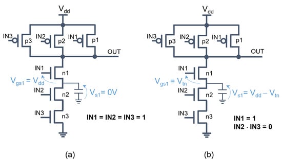 As can be seen, all parallel-connected transistors (pMOS for the NAND gate and nMOS for the NOR gate) exhibit the same average stress ratio equal to for the pMOS and for the nMOS transistors. Instead, the stress ratios of series transistors strongly differ. Let us identify the series transistors considering their distance from the output node as follows: transistors n1 (NAND) and p1 (NOR) are connected to the gate output, whereas transistors n3 (NAND) and p3 (NOR) are connected to ground and , respectively. Moreover, the stress ratios of transistors n3 (NAND) and p3 (NOR) depend on the respective input probability only, since the value of depends merely on the respective input voltage. Differently, transistors n1 (NAND) and p1 (NOR) turn out to be under stress only when all the series transistors are on. Let us clarify this point by analyzing the nMOS series transistors in a 3-in NAND gate, as depicted in Figure 1. When all three inputs are at a high logic value (Figure 1a), the source node of transistor n1 is completely discharged to ground (), and as a result, transistor n1 is under stress (). On the other hand, when at least one of the inputs IN2 and IN3 is at low logic value (Figure 1b), the n1 source is charged up to . As a result, it is , and according to (1), transistor n1 does not experience any stress condition, yet has its input at a high logic value. Similar considerations hold for the pMOS transistor p1 in a 3-in NOR gate.