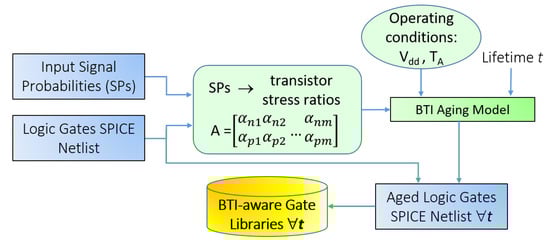 Figure 2 depicts the developed flow for evaluating the impact of the logic gate input signal probabilities on the stress ratios of their transistors, considering also the operating conditions (temperature and voltage) and lifetime. The obtained data for each gate were utilized to generate an “aged” library, which was then used to simulate complex circuits with all transistors mapped to the proper aging. The details are discussed in Section 4.