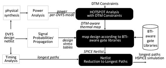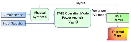 The impact of temperature variations on aging and the evaluation of the effect of different DVFS operating modes on the system thermal profile were assessed by devising a simulation flow that takes data about the physical synthesis of a circuit and its input statistics as the input and then generates the power analysis of each considered DVFS mode as the output. This information, together with the circuit layout feed the HotSpot tool [], which performs a thermal analysis of each operating mode. The block diagram of the developed flow is shown in Figure 3.
