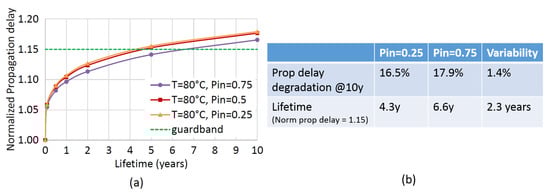 As for lifetime , it was evaluated as the time interval required for the propagation delay to degrade by 15% over the value at []. In doing so, it was assumed that the clock period was determined by considering the worst-case propagation delay increased by 15% in order to account for possible effects due to PVT variations. If the propagation delay exceeds this margin, then an incorrect signal propagation takes place, thus possibly causing a system failure. Therefore, at a generic operating time t is evaluated as: