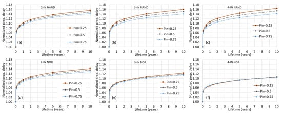 Figure 5 depicts the simulation results for the normalized propagation delay of basic logic gates NAND and NOR, with 2–4 inputs, for different values of the input probabilities. Namely, the two extreme cases and , together with the average case , = 2, 3, 4 were considered for the input probabilities. For all simulated gates and input probabilities, the delay degradation after only 6 mo of operation exceeds 50% of the overall degradation in 10 y of operation. It is interesting to note that delay degradation is dominated by pMOS transistors’ aging () and increases with the number of inputs for the NAND gate, whereas this decreases for the NOR gate. Indeed, the stress probability of series pMOS transistors in NOR gates diminishes noticeably with the increase in the number of inputs, as highlighted by the stress ratio expressions reported in Table 2 and Table 3. This consideration does not apply to the parallel pMOS transistors in the NAND gates.