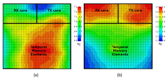 For LP mode, the maximum temperature (hotspot) is approximately C, while reaches for HP mode. In particular, the hotspot is experienced in the upper area of the circuit in HP operating mode, due to the higher dynamic power dissipation of the random logic implementing the Rx and Tx cores that are located in that area, compared to the memory in the lower part of the circuit. On the other hand, in LP mode, the hotspot is localized in the lower part, since in this case, the leakage power of the memory prevails over the dynamic power of the random logic.