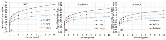 Normalized propagation delay for different aging temperatures for basic gates (; : normalizing factor): (a) NOT ( = 5.00 ps); (b) 2-input NAND ( = 8.08 ps); (c) 2-input NOR ( = 11.29 ps).