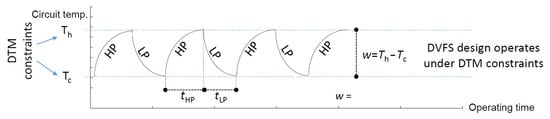 Consider the graph shown in Figure 9, which refers to a hypothetical circuit with two operating modes, the high performance (HP) and the low performance (LP), with frequencies . The operation of this circuit is controlled by a DTM system, which maximizes performance honoring pre-defined temperature constraints. While the circuit operates using , it heats up. When the temperature of the circuit reaches a pre-defined highest allowed temperature constraint , the DTM system forces the circuit to switch to LP mode with frequency , which causes the circuit to cool down. When the temperature drops to a pre-defined lowest temperature constraint , then the DTM system activates the HP mode again in order to maximize performance. This way, the circuit temperature is always in the admitted temperature window . The actual duration of each heat-up/cool-down time frame in this loop depends on the combination of the workload-induced switching activity and temperature of the circuit.