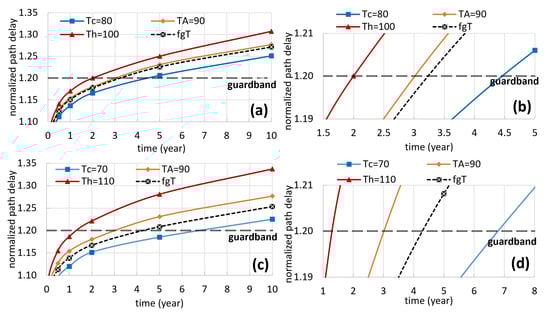 Next, we show that the deviation between the lifetime , and estimated considering DTM constraints , and average temperature , respectively, against the lifetime obtained with the proposed framework depends on the window size . In Figure 11c,d, the trend over time of the longest path propagation delay is depicted for and (w = ). From Figure 11d, the following values for the lifetime were derived: y, y, y, and y. Therefore, an optimistic evaluation using the temperature underestimated the detrimental effect of BTI on the lifetime of the circuit by 61.9% and a pessimistic one using the temperature overestimated it by . Additionally, when the average temperature between the two marginal constraints was considered, the BTI effect on the lifetime of the circuit was overestimated by 26.1%.