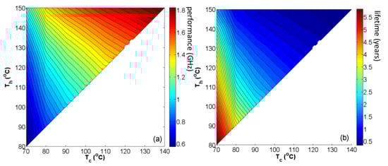 Figure 12 shows the results enabling design exploration in terms of performance (Figure 12a) and lifetime (Figure 12b), as a function of temperature constraints [], for all possible temperature couples in the range [70–150], with , that is the hot temperature was set to be at least higher than the cold temperature .
