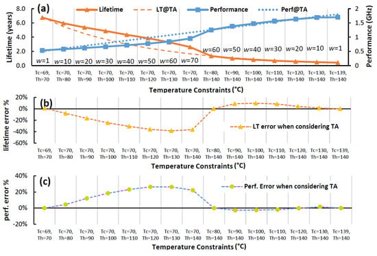 An analogous expression was used to calculate performance error. It is worth noting that at lower temperatures and while w increased, the underestimation of the lifetime using the average temperature also increased, reaching 35.8% for . At higher temperatures, the lifetime can be overestimated by more than 10% for . Similarly, Figure 13c depicts the error in the performance estimation. At lower temperatures and while w increased, the expected performance was overestimated by more than 20% for , reaching 26.3% for . At very high temperatures, the performance was slightly underestimated, with a difference lower than 1.2% over the fine-grained evaluation.