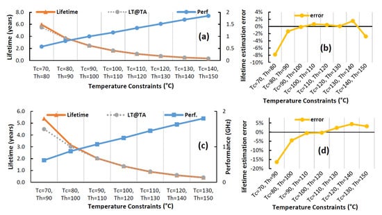 Next, possible trade-offs of various DTM constraints between lifetime and performance were examined. Figure 14a depicts the results for the constraints with a temperature window sliding in the range [70–150]. As the window slid towards higher temperatures, the performance increased almost linearly, due to the HP operating mode being utilized more, as expected. At the same time, the lifetime dropped asymptotically towards zero. Figure 14b plots the relative error when comparing the lifetime prediction against the lifetime computed by the proposed framework. The longest path was considered, and the lifetime estimation error was computed as in (11). The error was negative at lower temperatures, indicating that the lifetime estimation was optimistic, and became positive at higher temperatures, implying that it was pessimistic in this range. Figure 14c,d presents similar results for DTM constraints with . Note that these results were consistent with those in Figure 13 and showed that, as w increased, the error of lifetime estimation using marginal, or even the average expected temperature, also increased and a fine-grained temperature consideration was required, which was only possible using the proposed framework.