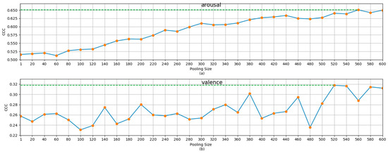 To illustrate the effectiveness of our model, we conducted extensive experiments on RECOLA and SEMAINE datasets. We found that, even if we add a secondary scale to the single scale with the best performance, its performance can still be improved. Of course, this increase is closely related to the selection of the secondary scale and the weight coefficient of the secondary scale, which needs to be carefully selected in practical operation. If we add the third scale, based on the combination of main and secondary scales with the best performance, it will not significantly improve the optimal performance. However, the result is not very sensitive to the weight coefficient. Therefore, this combination of three tasks is an infallible choice when there are no conditions for parameter optimization. Through the experimental results for the two datasets, this model is shown to have no definite law for which the dimensions of arousal and value have a better performance improvement effect. On the RECOLA set, the performance improvement for the arousal dimension is significantly better than that of the valence dimension. On the SEMAINE set, the result is the opposite. This may be caused by different data characteristics, due to the different annotation methods of the dataset. As can be seen from Figure 3, for the results of the arousal dimension, when the pooling size is greater than 560, the degradation of recognition performance is not obvious. There may even be an increase. This shows that the noise reduction caused by using a larger scale is much greater than the loss of information reduction. This may be due to the large noise caused by the fact that the annotator needs to label the values of several dimensions at the same time during the rating process.