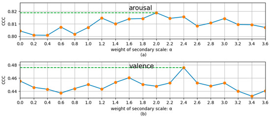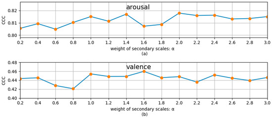 To study the influence of the weight coefficient of the secondary scale, we used different to perform the MSMT experiments. The experimental results for the development set for arousal and valence dimensions are shown in Figure 4, where means that only the main scale was used. From Figure 4, we can see that, for the recognition of the two dimensions, the recognition performance slightly decreases when the secondary task is applied and then first increases and then decreases with the increase in . For the arousal and valence dimension, the best performance (the results in Table 5) is achieved when is about 2 and 2.4, respectively. This indicates that by choosing an appropriate weight coefficient, , the continuous dimension emotion recognition on the main scale can be promoted by the recognition on the secondary scale. Experiments show that the best performance is generally obtained when . Therefore, all our MSMT experiments chose the best alpha in the interval (0,3].