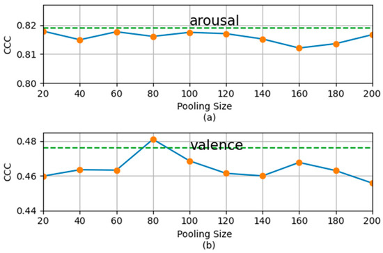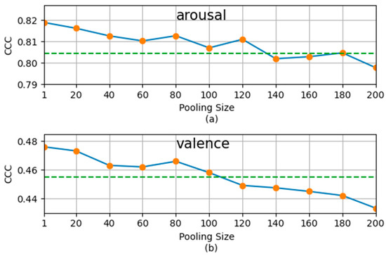The SSST recognition results (measured by the average CCC of five experiments) with different pooling sizes for the development subset of the RECOLA dataset. (a) Results for arousal dimension; (b) results for valence dimension.