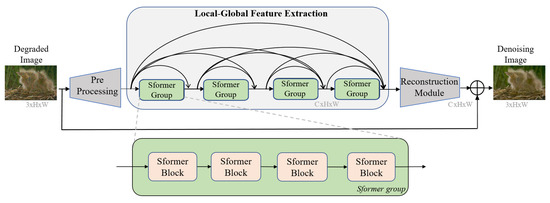 As shown in Figure 1, DenSformer is composed of the preprocessing module, the local-global feature extraction module, and the reconstruction module. The preprocessing module contains a 3 Γ— 3 convolutional layer to extract shallow features from the input image I i n ∈ R H Γ— W Γ— C i n (Naturally, H, W are the height and weight of the image, and C i n is the channel number of the given image). Then, the shallow features F 0 ∈ R H Γ— W Γ— C can be obtained, where C is the channel number of the shallow feature. It can be represented as,