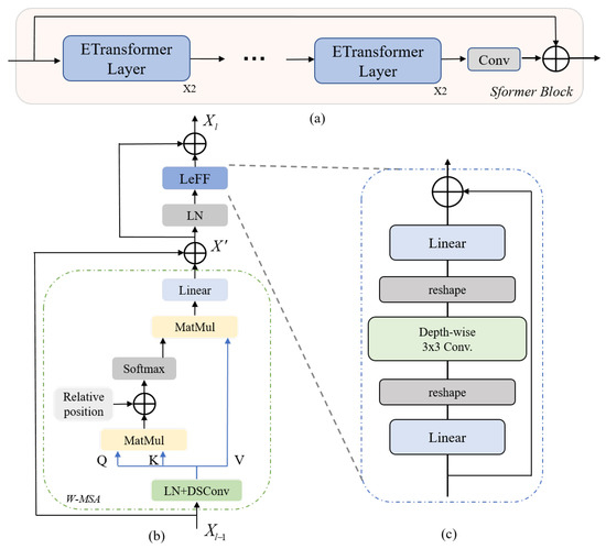 Figure 2. (a) Sformer block. (b) Architecture of the ETransformer. (c) Structure of the LeFF.