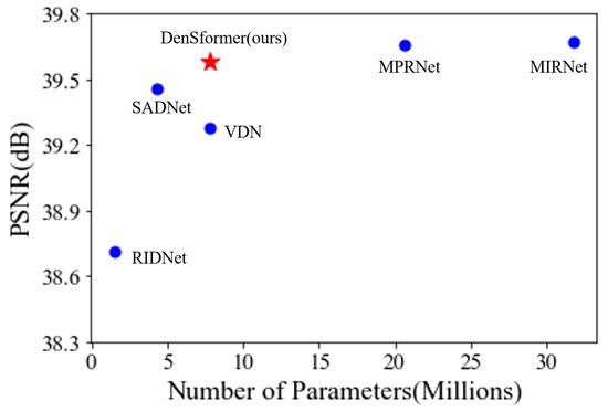 Figure 5 and Figure 6 show the subjective comparison results of each method on the SIDD and DnD dataset, respectively. From the visualization results, we can find that the traditional algorithm BM3D is not good at denoising the real noise. While CBDNet can remove part of the real noise, the image after denoising is very blurred, and the image restored by RIDNet is too smooth, and the details are not clear enough. The image restored by our method is close to the results of other excellent algorithms such as MPRNet and Uformer, which can restore the image more clearly. As shown in Figure 7, DenSformer achieves competitive quantitive results with fewer parameters, which has a good balance between the PSNR result and model size.