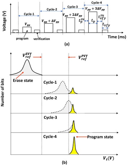 A page program operation in the NAND array utilizes an incremental step pulse program (ISPP) scheme with multiple program cycles, as illustrated in Figure 2a. Each program cycle consists of a program pulse, followed by a verification phase. During a program pulse phase, a high voltage (~15–18 V) is applied to the corresponding WL to cause the injection of electrons into the FG/CTs of the memory cells that need to be programmed. The verification phase identifies the cells that have reached the required threshold voltage, , by performing a page read operation, with a program verification voltage () applied on the corresponding WL. Thus, the represents the minimum voltage of the program state distribution. The cells whose exceed are identified as “programmed”, and they are subsequently locked out from further programming using a program inhibit scheme. The following program cycle starts with an incrementally higher voltage on the WL, which increases the chances that the cells that did not switch their state in the previous cycle become programmed []. This sequence of the program and the verification steps continue until most of the cells that are supposed to be programmed are, indeed, programmed.