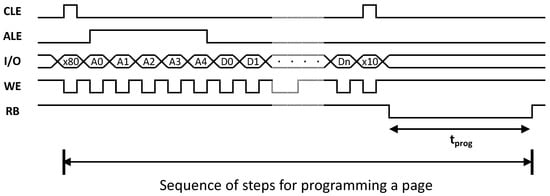 Figure 3 illustrates a sequence of commands that carry out a page program operation. The operation is initiated by the host that sends the command (0x80) to the device through the data lines. Next, the host writes five address cycles (A0-A4), while keeping the ALE signal high. Next, the host controller sends the data to be written to the device’s data register, byte by byte. Finally, the host sends the PAGE PROGRAM command (0x10) that initiates the write operation to the specified page of the flash memory array. During the page program operation, the device’s status control pin RB (Ready/Busy#) is low, indicating that the device is currently busy. Upon completion of the program operation, the RB signal is set high. Thus, the host can determine the page program time () by monitoring the state of this pin after issuing the command sequence.