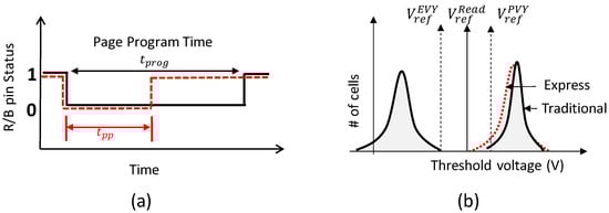 Figure 4a illustrates the proposed EXPRESS technique. The solid black line represents the status of the RB pin during a regular page program operation. This pin goes low, indicating that the NAND array is busy for the duration of the program operation, The value lies in the range of 300–600 s for an SLC memory page of the chip used in this study []. The program operation, however, can be terminated prematurely using a RESET command, such as the program suspend operation []. In this case, the state of the RB pin is illustrated with the red dashed line. The premature termination of the program operation results in a partial program operation. Although this operation may slightly increase the bit error rate (BER), it can significantly reduce the time and energy of the page program operations. The critical parameter that enables an exploration of the tradeoffs between the energy and the accuracy is the partial program time, . The following equation can be used to estimate the :