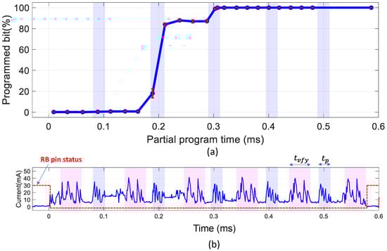 Effects of partial-page program operation: (a) percentage of programmed bits in an SLC memory page as a function of partial-page program time, ; (b) the current drawn by the memory chip during a regular-page program operation.