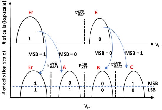 MLC flash memory cells store 2 bits of information, and, hence, there are two different types of logical pages sharing a single word line. These two bits correspond to four states of the flash memory cells, i.e., the information is encoded in the form of four threshold voltage distributions (Er-11, A-01, B-00, C-10), as illustrated in Figure 7. The most significant bit (MSB) of the logic states of all the memory cells connected to a given word line forms the MSB page. Similarly, the least significant bit (LSB) of the logic states of the memory cells from the same word line forms the logical LSB page. The LSB page programming involves raising the erase state () of certain cells to the B-state, as is shown in Figure 7. The MSB page programming is performed after the LSB page programming is finished. During MSB page programming, certain memory cells from the Er state go to the A state, and certain cells from the B state go to the C state, as is shown in Figure 7. Two read reference voltages are used to read the MSB page data, whereas only one read reference voltage is needed for reading the LSB page data.