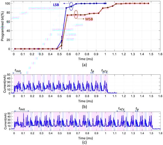 Figure 8b,c shows the current drawn by the chip during a page program operation for an LSB page and an MSB page, respectively. Similar to the SLC current profiles, we observe the periodic program pulses and verify the phases in the current waveform. For example, the LSB page, analyzed in Figure 8b, requires nine ISSP cycles, with the total program time, . However, the bit accuracy reaches above 99% with only seven program pulses (), indicating a 25% energy saving with a <1% bit accuracy loss. Programming MSB pages generally requires more time than programming LSB pages. For example, the MSB page analyzed in Figure 8c requires , ISPP cycles. In addition, the verification phases in the case of MSB program operations take more time than those that take place during LSB program operations. Still, we find that partial program operations can be utilized on MSB pages, offering more than 20% in energy savings, with a negligible (<1%) bit-accuracy loss. The optimal partial program time for MSB pages is .