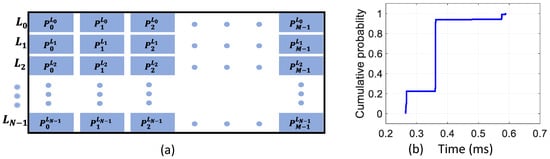 3D NAND flash memories exhibit page-to-page variations because of the unique nature of the array geometry and the intrinsic process variations within the array. Figure 9a shows the organization of a 3D NAND memory block configured in the SLC mode. The pages in a block are organized in rows that correspond to the physical vertical layers () and columns that correspond to the sub-blocks (). A page number within a block can be expressed as , where represents the layer number, and . The chip under evaluation has 32 layers () where each layer contains 16 logical pages () of a given memory block. Thus, there are a total of 16 × 32 = 512 pages within a block. We performed a characterization of the page program times by sequentially programming all of the pages of a memory block using a random data pattern. Our characterization results are shown as a cumulative distribution plot in Figure 9b. The results indicate that the standard-page program time varies significantly among different pages within the same block. Since the implementation of EXPRESS requires an estimation of the on the basis of the nominal page program time (), it needs to be adapted in order to account for the page-to-page variability.