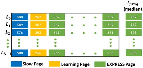 To address the observed variabilities, we propose the following modification to EXPRESS. The nominal program time variation among slow pages (marked as blue boxes in Figure 10) is minimal. Consequently, the flash controller may apply EXPRESS on the slow pages by learning the corresponding from the first page of the block (). The remaining pages of the block are classified as learning pages (yellow) and EXPRESS pages (green). The nominal page program operations are performed on the learning pages to acquire the exact value, and EXPRESS is applied on the remaining pages of the layer () by estimating the corresponding using Equation (2).