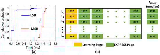 (a) Cumulative distribution of program times for LSB (blue) and MSB (red) pages in a block in fresh condition; (b) Express algorithm for MSB pages. The numbers represent the nominal values in μs corresponding to the page location.